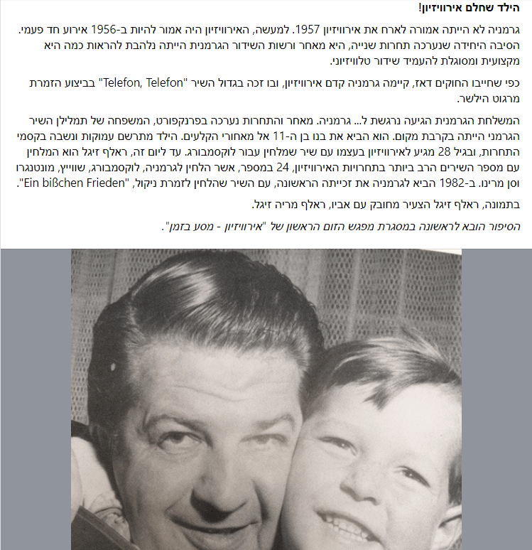 על הפעם הראשונה של Ralph Siegel באירוויזיון אי שם ב-1957 ניתן לקרוא בפוסט הבא, שכתבתי בקבוצת הפייסבוק "אירוויזיון IL":