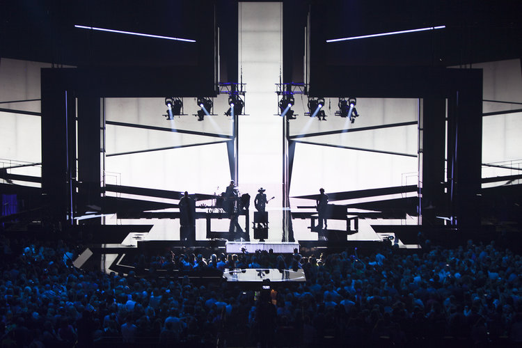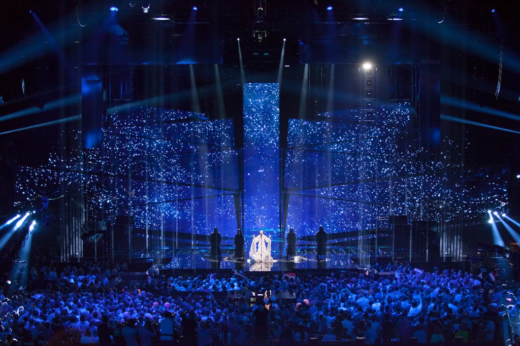 מה שהכי לא ברור הוא הקשר של התצוגה הגרפית לעיצוב הבמה. מעצבי הבמה השתמשו באור על מנת ליצור עומק והרגשה רב מימדית. הקיר האחורי העשוי ממסכי LED שנעים, כמו מן קיר המתפרק לחלקיו ויוצר דינמיות מאד מרשימה טכנולוגית וחזותית. הרעיון היה ליצור אשליות אופטיות, ואכן הבמה נראית שונה בכל הופעה ויוצרת מרחב אישי לכל מדינה שמופיעה שבו היא יכולה להתבלט. הבמה עצמה נראית כמו פלוס (+) גדול, ויש catwalk קטן וכמעט בלתי נראה, המוביל לבמה קטנה מלפניה, תופעה שכבר הפכה להיות סטנדרט בתחרויות האחרונות.