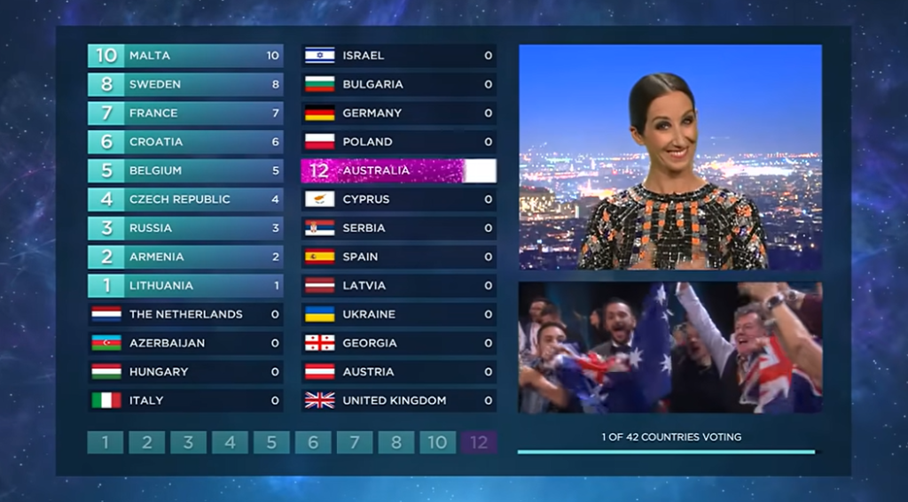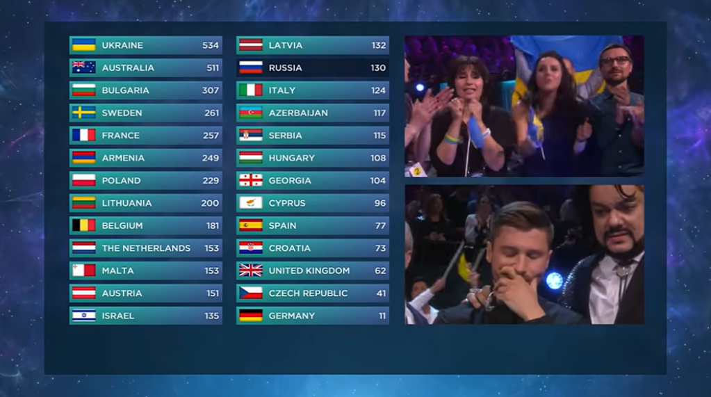 השיר הזוכה עדכני ומודרני, אך יוצא מהלופ הפופי שהביאו שאר המדינות. הקהל בוחר, לעומת זאת, בשיר אחר מתוך הלופ, אירופופ מיושן ודיסקואי. שזה מעניין, כי ממש כמו בשנה שעברה, כשהקהל בחר ב-Il Volo האיטלקים הקיטשיים והמיושנים, וזכייתם סוכלה על ידי השופטים שהעדיפו את שבדיה, השנה הקהל בוחר ב-Sergey Lazarev עם להיט איוטראש מיושן, אבל השופטים מסכלים בחירה זו על ידי הענקת ניצחון לאוסטרליה, שיר מצעדים טיפוסי. הקהל לא תומך מספיק ב-Dami Im האוסטרלית והניצחון הולך לאוקראינה. וזו ההזדמנות להזכיר את אוסטרליה. בשנה שעברה היא הייתה משתתפת אורחת שהעפילה אוטומטית לגמר. השנה היא משתתפת בחצי הגמר ככל משתתפת אחרת, שאינה מ-5 הגדולות + המארחת. חבל שהופעת אורח חד פעמית הפכה להופעה קבועה ובכך שברה את המסורת של התחרות. התחרות כעת פתוחה לכל, ויש לי הרגשה שאוסטרליה היא לא האחרונה להצטרף לחגיגה…