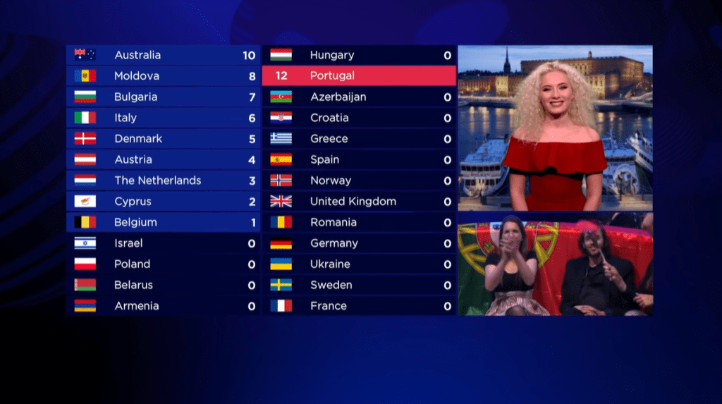 * השיר הפורטוגלי זוכה הן בהצבעת הקהל והן בהצבעת השופטים, דבר שלא קרה מאז 2014 ובפעם הראשונה מאז אופן חלוקת הניקוד החדש.