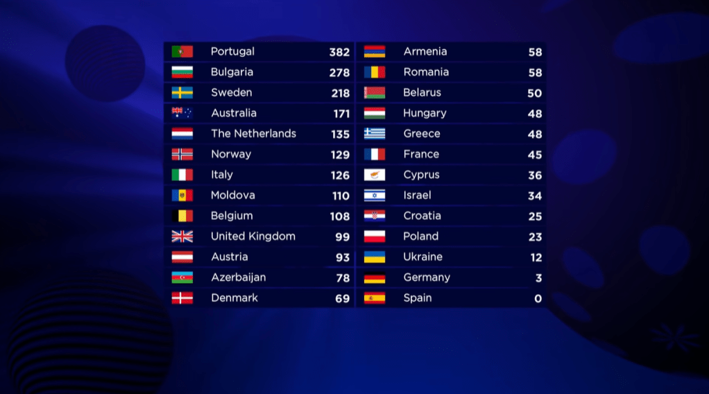במקום השני נמצאת בולגריה ובמקום הראשון פורטוגל, מה שאומר שפורטוגל זוכה לראשונה בהיסטוריה של התחרות. והיא עושה זאת עם זכייה הן בקהל והן בשופטים.