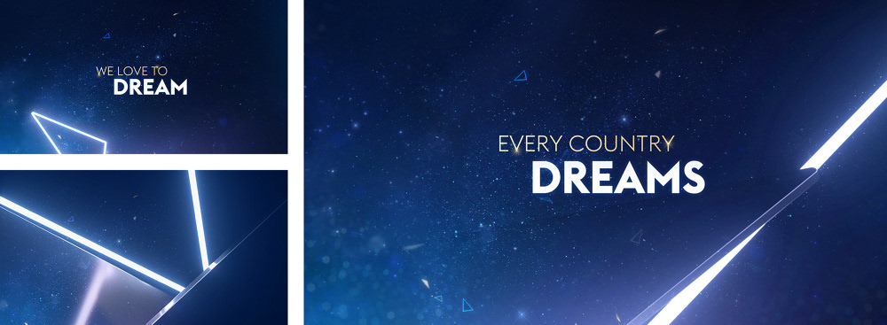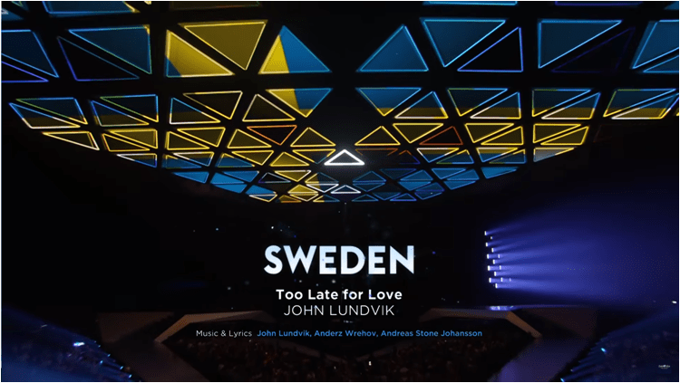 אחרי כל גלויה דגל המדינה המופיעה, מופיע על התקרה אשר מעל הבמה, העשויה משולשי LED. בתחתית המסך באמצע מופיע שם המדינה בלבן, ומתחתיו שם השיר ושם המבצע, בלבן גם כן. מתחתיהם שמות כותבי השירים בכחול. לדוגמה: