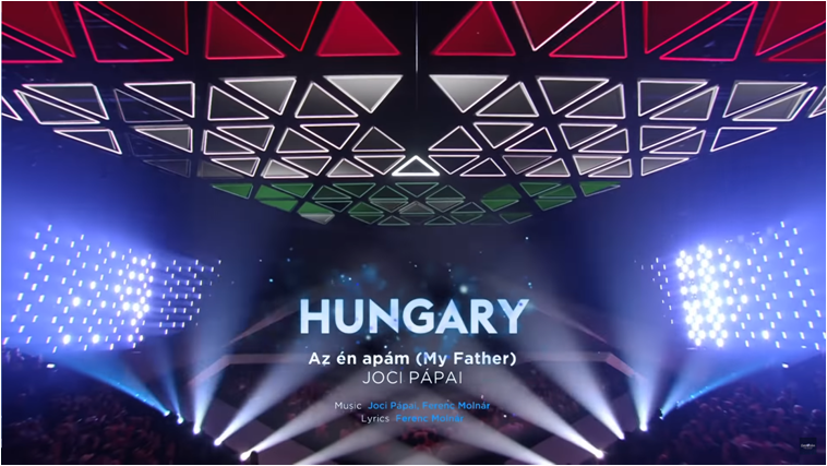 הונגריה – בלדת פופ שמתחילה כאקוסטית וממשיכה עם מעט קישוטים אלקטרוניים בהשפעה אתנית-צוענית. את השיר כתב Joci Pápai על אביו, ומכאן גם שם השיר. המוזיקה נהדרת, האווירה נוסטלגית, מלאת אהבה וערגה, גם אם נעדרת דרמה. הפיזמון פריך ועגול, אמוציונלי ועצוב. מדובר באחד הזמרים הטובים מבחינה טכנית, אך לא רק. בלייב הוא מעביר את השיר אמוציונלית ולבדו. הוא לבוש אאוטפיט שחור פשוט ואלגנטי עם שרשרת זהב, ומתהלך על הבמה יחף. Pápai ממלא את הבמה בכריזמה שלו ונראה שיקי מאד. בוידאוארט עץ זהב, ששורשיו מופיעים על רצפת הבמה והעץ עצמו ברקע. השילוב של הזהב והשחור נראה נפלא. במהלך השיר מופיעים תמונות ראשים של אבות. זה נראה מוזר למי שלא מבין את מילות השיר וקצת פוגם באסתטיקה הכללית.