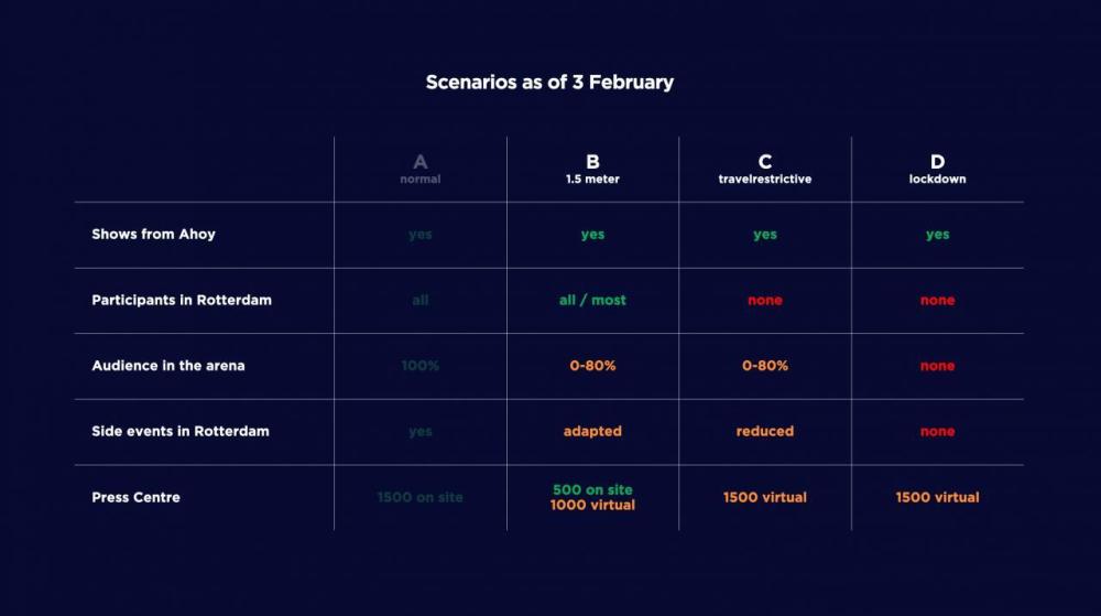 בתחילת פברואר 21' איגוד השידור האירופי, הטלוויזיה ההולנדית ועיריית רוטרדם הכריזו כי תרחיש א' לקיום האירוויזיון ירד מהפרק.