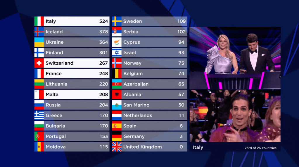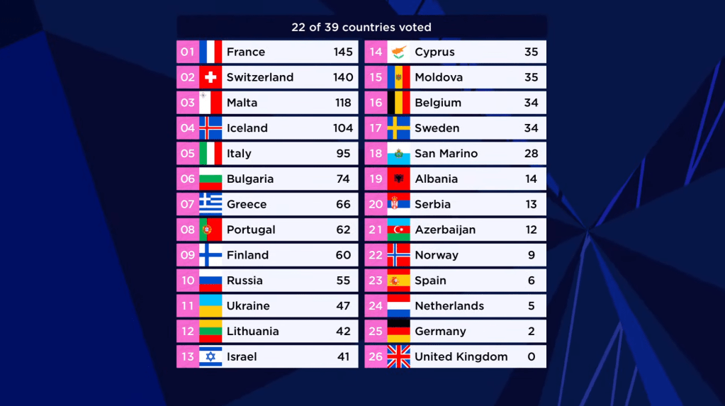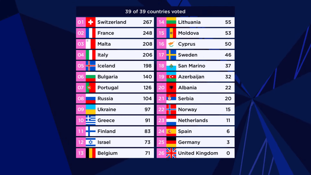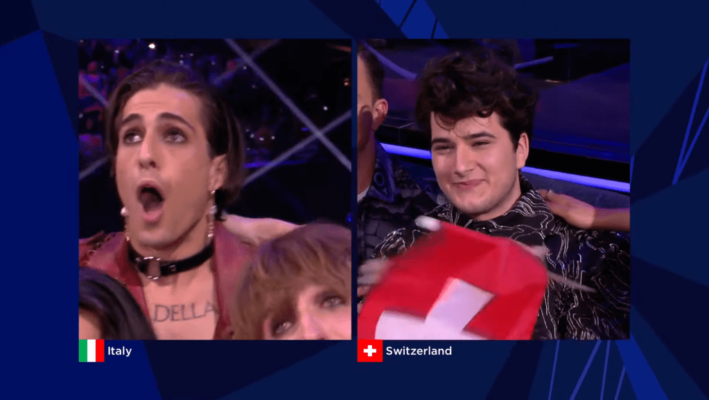 המסך מתפצל ומראה את הארבעה שמתמודדים כעת על הניצחון: איטליה, שווייץ, צרפת ומלטה. מלטה מקבלת 47 נקודות בלבד ולא מצליחה אפילו להיכנס לטופ 5. צרפת מקבלת 251 נקודות ונמצאת במקום השני 25 נקודות אחרי איטליה. שווייץ מקבלת רק 165 נקודות, מה שמספיק עבורה רק למקום השלישי.