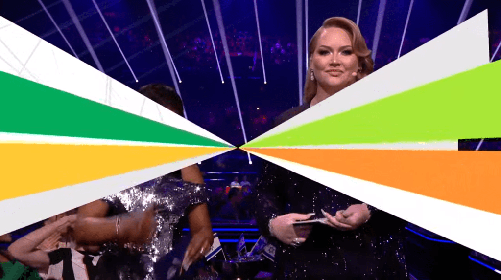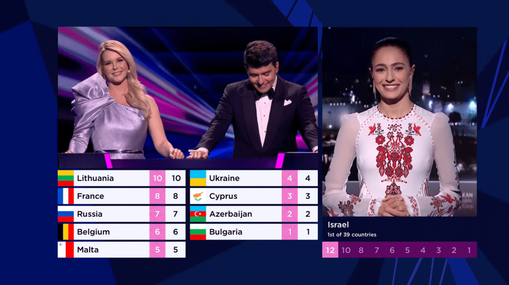 Chantal Janzen ו-Jan Smit מציגים את הצבעת השופטים. לוח הניקוד פשוט ונקי, בצבעים של כחול וסגול. שמות המדינות בשחור על גבי לבן. הדגלים בריבוע סימטרי.