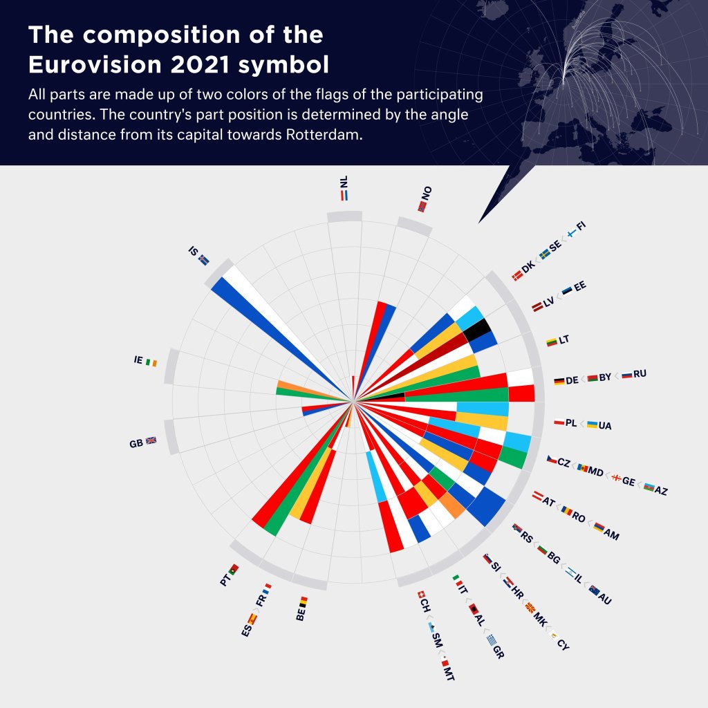 העיצוב האמנותי של התחרות היה למעשה העיצוב של האירוויזיון שבוטל, אשר עבר שינויים ושדרוגים. כפי שפורט לגבי הסמליל והעיצוב של 2020, הצורות הצבעוניות "מסמלות את 65 השנים של התחרות ו-41 המדינות הצפויות לקחת בה חלק. התחרות נוצרה כעשור לאחר מלחמת העולם השנייה במטרה לקרב בין המדינות באמצעות מוזיקה. בעשורים האחרונים בתחרות נפתחה למדינות חדשות, כישרונות חדשים וטכנולוגיות חדשות. על מנת לאכוף מחדש את המסר הזה, נוצר סמל מבוסס דאטה, אשר חוגג את הסיפור של האירוויזיון באופן עכשווי. הסמליל הוא ייצוג אבסטרקטי של דגלי 41 המדינות המשתתפות ונבנה על העיצובים של התחרויות הקודמות שאירחה הולנד". העיצוב החדש של 2021 הוא בהשפעת מפת העולם, כאשר רוטרדם היא הלב הפועם של אירופה במאי 2021. "הלוגו מחבר את רוטרדם עם בירות המדינות המשתתפות ומסמל את האיחוד ביניהן," כך לדברי Bakker. כל חלק בסמליל מורכב משני צבעים של דגלי כל המשתתפות. המיקום של דגל המדינה הוא בהתאם לזווית של בירת המדינה ולמרחקה מרוטרדם. על העיצוב הייתה אחראית, כמו ב-2020, סוכנות העיצוב המקומית, CLEVER°FRANKE.