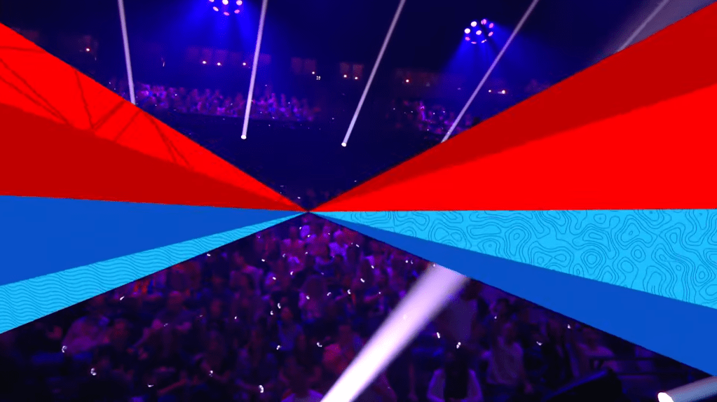 אחרי כל גלויה, הפסים הצבעוניים ממלאים את המסך ומזריקים צבע לשם המדינה, המופיע במרכז המסך. דגל המדינה המופיעה מופיע על התקרה אשר מעל הבמה, העשויה צינורות LED. שם המדינה במרכז המסך עובר לצבע לבן. מתחתיו שם השיר ושם המבצע, בלבן גם כן. מתחתיהם שמות כותבי השירים בלבן. זה מאד דומה למה שנעשה באירוויזיון 2019. לדוגמה: