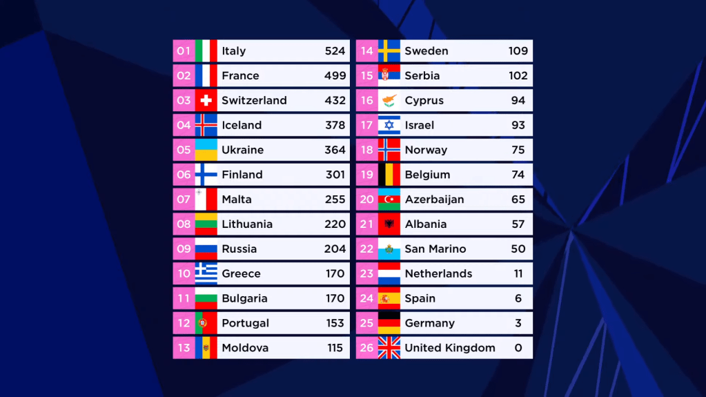 איטליה זוכה בתחרות אחרי 31 שנים. צרפת במקום השני, שווייץ שלישית. איסלנד ואוקראינה חותמות את הטופ 5.