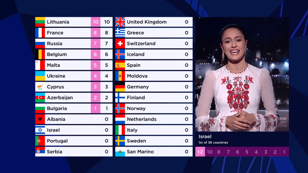 * לראשונה מאז שיטת הניקוד החדשה שהונהגה ב-2016, מדינה אחת מסיימת עם 0 נקודות הן מהשופטים והן מהטלווטינג – בריטניה.
