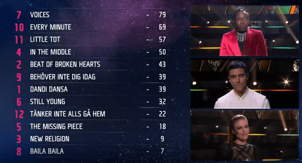 Anton Ewald – New Religion – בטרום הגמר כתבתי: "מידטמפו עד אפטמפו פופ-RnB. הבנתי שהמפיקה Karin Gunnarsson הייתה מאוכזבת מזה עד עמקי נשמתה. לשיר יש פזמון חזק, קליט, אבל הסגנון הזה לא עובד באירוויזיון. ההרגשה היא של שיר בית חרושת. לא טבעי, לא אותנטי ו-Ewald נראה כמו דג מחוץ למים. הוא מופיע עם חולצה לבנה וז'קט שחור-זהוב עם שני רקדנים בלבוש תואם. אגרסיבי ומכוון להיות להיט, אבל נעדר לב. 2/5."