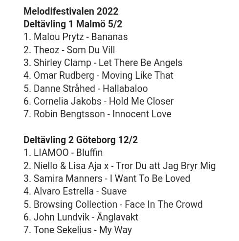 30 כותבים שלחו את שיריהם (לא ברור בכמה שירים מדובר), ומונטנגרו צפויה לבחור את השיר שלה לאירוויזיון 2022 עד סוף החודש. מקור.