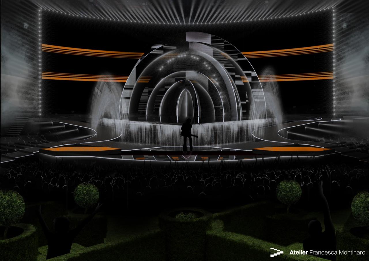 היא לקחה בחשבון את האופי הכוללני של האירוויזיון ואת הכנסת האורחים של האיטלקים כשעיצבה את הבמה. "מפלי המים מהווים מסגרת לבמה, ומייצגים את הים הסובב את המדינה, סמל לתרבותנו המורכבת. הבמה היא חצי אי, מדינה שאליה כולם מוזמנים, לא משנה מהיכן הם מגיעים… האמנים והמשלחות יאורחו בגן האיטלקי העשיר, שם הצמחייה משתלבת עם קרני שמש, תלויה בין מציאות לדמיון, ומעבירה אותם לממד אריכטקטורי עליז." רשות השידור האיטלקית הבטיחה כי הבמה תהיה קלאסית, אך בו זמנית מודרנית, תשלב את הדיגיטלי עם האנאלוגי, ותדגים טווח של תאורה ותנועה. ובכן, החלק של התנועה פחות עבד.