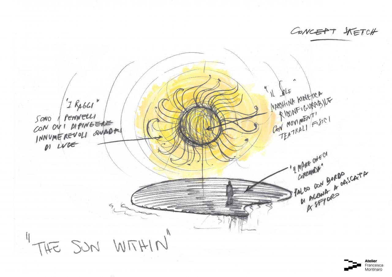 הבמה כונתה "The Sun Within" ועיצבה אותה Francesca Montinaro, וכך היא אמרה: "השמש הקינטית נעה במעגלים והיא מקור לאפקטי תאורה. היא שולטת בבמה ומייצגת את הגישה האיטלקית: תמיד בתנועה, מרדנית, יצירתית, מסבירת פנים, מלאת תשוקה, אינטואיטיבית. אנחנו אלו עם השמש בפנים, וזו דרכנו להיות בעולם."