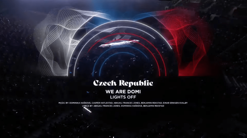 אחרי כל גלויה, עיגולים המדמים שמש מוצגים בצבעי דגל המדינה, המתעתדת להופיע, על רקע לבן. לאחר מכן, על רקע האולם מוצגת הדמייה של השמש הקינטית בצבעי דגל המדינה המופיעה. הצבעים מופיעים גם מסביבה בטקסטורה של רשת אלקטרונית. מתחת לשמש מופיע שם המדינה בלבן בפונט שנבחר להציג את סיסמת התחרות. מתחתיו שם המבצע, שם השיר וכותבי השיר בפונט ניטרלי, בלבן גם כן. לדוגמה: