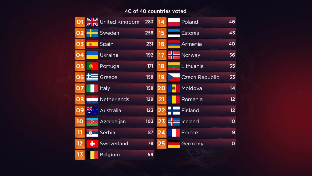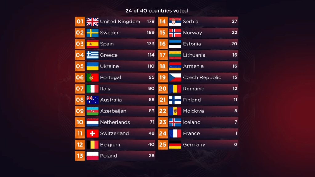 אבל בחזרה למאי 2022. אחרי שנים של מיקומים סופיים משפילים, בריטניה וספרד חוזרות בענק. בריטניה באמצעות בחירה פנימית חכמה למדי, של שיר לא מתחכם, אבל של כוכב טיקטוק כריזמטי וחמוד ביותר. במקרה של ספרד, האסטרטגיה הייתה שונה, הם מחליטים להשתמש בפלטפורמת של פסטיבל מוזיקה ותיק, בשם פסטיבל בנידורם על מנת לבחור את נציגתן לתחרות. ההחלטה משתלמת, ושתי המדינות מסיימות במקומות השני והשלישי בהתאמה. אלו מיקומים שהן לא זכו להן מאז שנות התשעים. רבים מהצופים הצעירים לא זוכרים או לא חוו את בריטניה כאימפריית אירוויזיון, אך האם ההצלחה הזו בטורינו היא תקופה חדשה בחייהן של בריטניה וספרד? לא הייתי ממהר לשים על כך כסף.