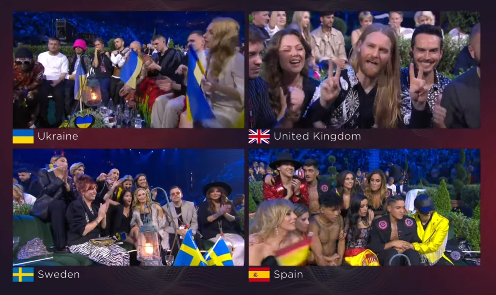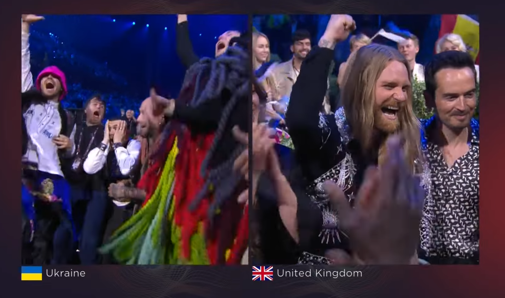 Kalush Orchestra עולים לבמה מנופפים בדגלי אוקראינה. גם נציגות איסלנד בגרין רום מנופפות בדגל אוקראינה. סולן הלהקה קורא לניצחון המדינה במלחמה, ומודה על התמיכה במדינה. חברי הלהקה פוסעים מהבמה הקדמית אל הבמה המרכזית. המנחים מדברים בשבח השלום, ו-Pausini טוענת שזהו "הצליל של היופי". המנחים לא מפסיקים לדבר על הבמה, בעוד חברי ההרכב האוקראיני ממשיכים להתכונן. בגרין רום אנשים מתחבקים זה עם זה. מאז 1991 לא שמעתי מנחים שמדברים כל כך הרבה. Kalush Orchestra נותנים ביצוע נוסף ואחרון ל-"Stefania". זוכה מוראלי, אין מה לומר.