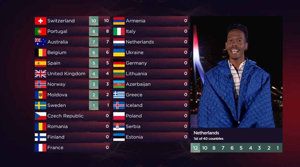 * הבדלים בין הקהל לשופטים: בחצי גמר 1, שווייץ ממוקמת חמישית בשופטים ורק במקום ה-16 בקהל. מולדובה 13 בשופטים ושנייה בקהל. בחצי גמר 2, אזרבייג'ן ממוקמת שישית בשופטים ו-18 ואחרונה בקהל. רומניה 14 בשופטים וחמישית בקהל. קפריסין 18 ואחרונה בשופטים ותשיעית בקהל. בגמר, פורטוגל ממוקמת חמישית בשופטים ו-15 בקהל. אוסטרליה תשיעית בשופטים ו-24 בקהל. אזרבייג'ן עשירית בשופטים ו-23 בקהל. שווייץ 12 בשופטים ו-25 ואחרונה בקהל. נורבגיה 17 בשופטים ושביעית בקהל. מולדובה 20 בשופטים ושנייה בקהל.