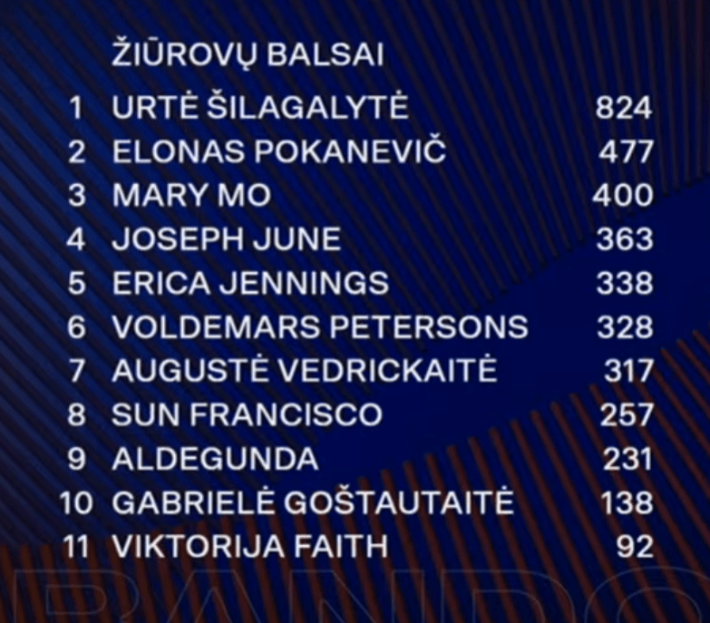 Urtė Šilagalytė – Running Chords – היא נראית כמו הזמרת שפתחה את הערב… גם היא עולה באאוטפיט שחור, שעשוי רובו תחרה. השיר עצמו עומד בקונטרסט מוחלט לאיך שהיא נראית. זו בלדה קודרת, שמופקת יתר על המידה. הפזמון דרמטי, שלא לצורך, אפוף כינורות ותופים. בוידאוארט ברקים, מים סוערים וטורנדו. מנסים בכוח למכור דרמה, אבל אין כאן כלום. 2/5.