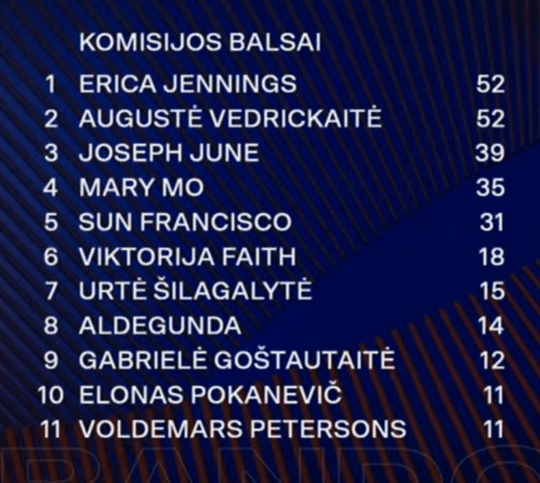 Aldegunda – Holiday -טוב, זה לגמרי נשמע כמו הקדם הליטאי, טוב שהזכרת לי איפה אני. הזמרת עולה באאוטפיט שחור, הכולל עור, תחרה וכו'. עמה שתי רקדניות חסרות כישרון וחן. פופ-EDM. בפזמון העיבוד משתלט על המלודיה והרעש נעשה בלתי נסבל. זה רפטטיבי ועצלני. עכשיו הבנתי למה החובבים מתכוונים, זה לוקח יותר מידי אלמנטים מ-"Womanizer" של Britney Spears. לקראת סוף השיר היא עוברת לשיר בלדה בליטאית. כמה מוזר. 1/5.