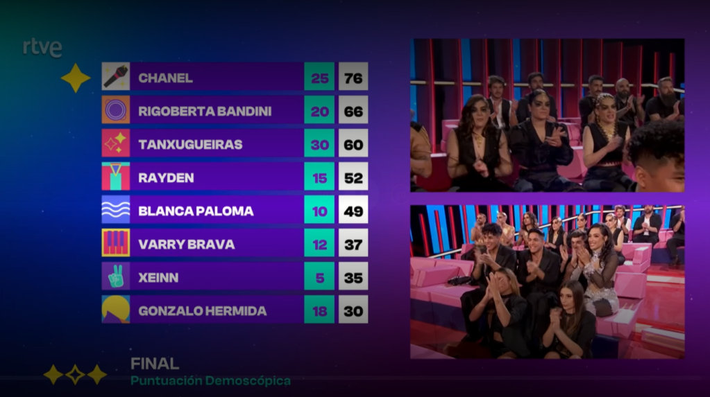 ועכשיו תוצאות צוות השיפוט הדמוסקופי, שקולותיו מהווים 25% מהתוצאה הסופית: