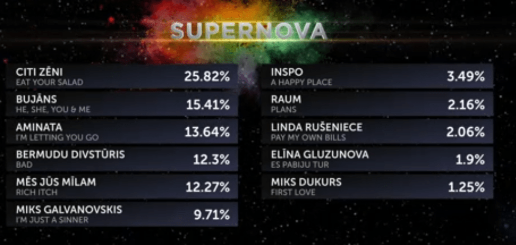 ברוכים הבאים לקדם הלטבי, ה-Supernova. אחד עשר מתמודדים העפילו לגמר. אחד מהם ייצג את לטביה בטורינו במאי הקרוב.