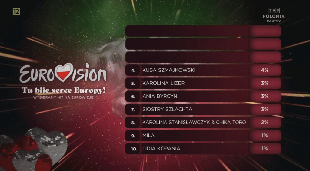 ברוכים הבאים לקדם עם השם הכי ארוך, הקדם הפולני. מי ימשיך את דרכו של Rafał וינסה להביא את האירוויזיון לוורשה? ההצבעה היא 50% שופטים ו-50% קהל. שלושת המקומות הראשונים יעפילו לסופר-גמר.