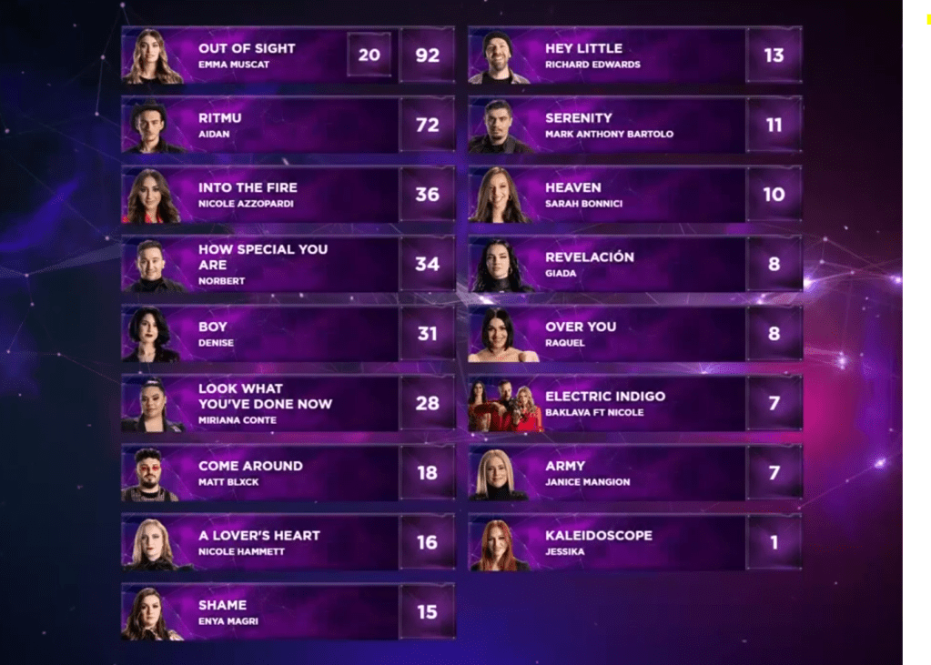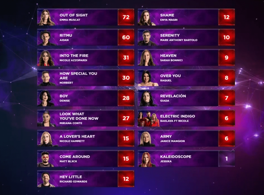 Emma Muscat – Out of Sight – בחצי הגמר כתבתי: "היא מבצעת את השיא בעוד מנגנת על פסנתר. הבמה אפופת עשן, והוידאוארט מציג את פניה. היא לובשת אאוטפיט כסוף חשוף, ונעמדת ופוסעת קדימה בפזמון הראשון. זה שיר שנורא רוצה להיות חזק ואפקטיבי. הם השקיעו בהופעה, אבל שכחו שהשיר עצמו, נחמד ככל שיהיה, לא חזק מספיק כדי לסחוב קדם. כמבצעת, היא עושה עבודה נהדרת. 3/5. "