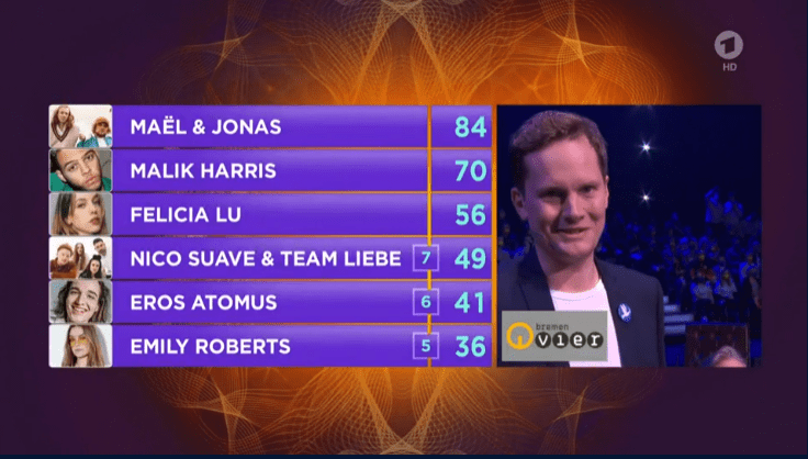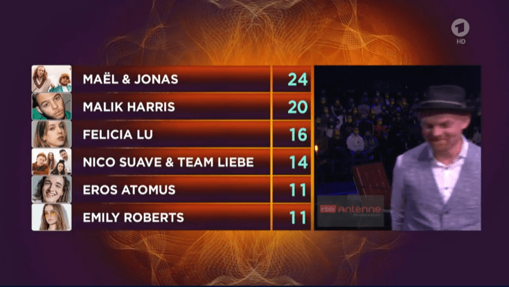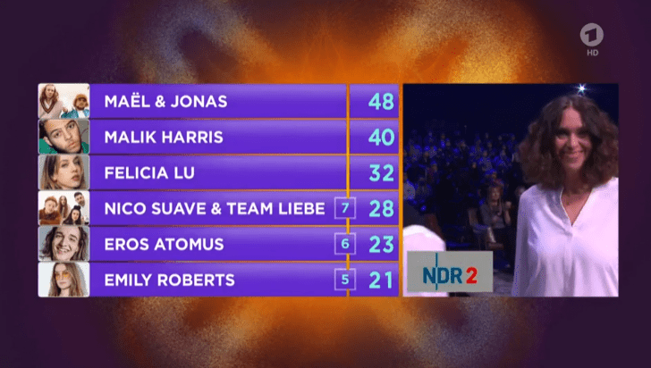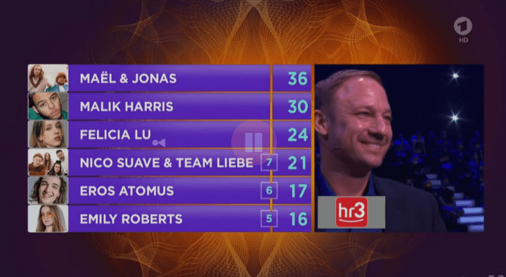 Felicia Lu – Anxiety – עוד פייבוריטית, כמעט ברמה שווה לזה של Malik Harris. שניהם ייתחרו על קולות הצעירים. היא עולה עם חליפה סגולה וחזייה שחורה. זה אלקטרופופ ואינדי-פופ עם השפעות רוק. השיר קליט, יחסית עדכני, קצבי עם שירה מהירה. כנראה הבחירה הנכונה ביותר של גרמניה להערב, אבל הערב הולך להיות כנראה של ההרכב האחרון… 3/5.