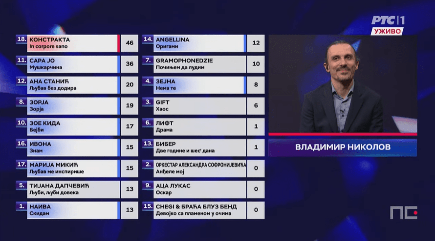 ניקוד השופטים מתורגם ל-1-8, 10 ו-12 נקודות. בעקרון Sara Jo ו-Konstrakta בשוויון, אבל האחרונה מקבלת את ה-12 של השופטים, למרות ש-Sara Jo קיבלה ניקוד מכל השופטים לעומתה…