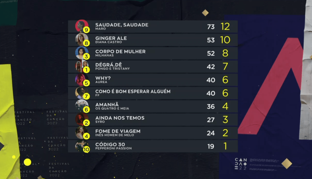 Maro – Saudade, saudade – בגרסת הסטודיו: ה-פייבוריט של החובבים, שהם מאמינים שיביא את האירוויזיון לליסבון או לפורטו ב-2023. אבל הפורטוגלים בשנים האחרונות לא בחרו בפייבוריטים, אז לא הייתי ממהר להכתיר מנצחת. השיר נפתח בצלילי פסנתר במונו. מדובר בבלדה עד מיטדמפו, המשלבת מוזיקת נשמה ודאונטמפו עם צלילי מוזיקת עולם. ברמה המקומית אציין שהיא נשמעת מאד כמו מרינה מקסימיליאן. זה טוב, אבל אני מרגיש שהרבה באירופה ירגישו מנוכרים לזה. 3/5.