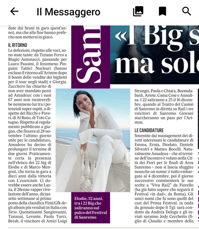 שמועות טוענות לדואטים של Alessandra Amoroso feat. Emma ו-Lazza feat. MEDUZA בפסטיבל סנרמו. ההנחה היא שמדובר בשת"פים במסגרת מופעי הביניים, ולא במתמודדים מן המניין.