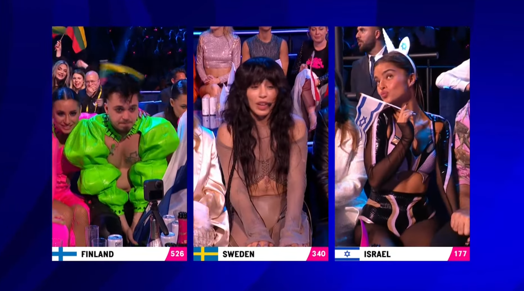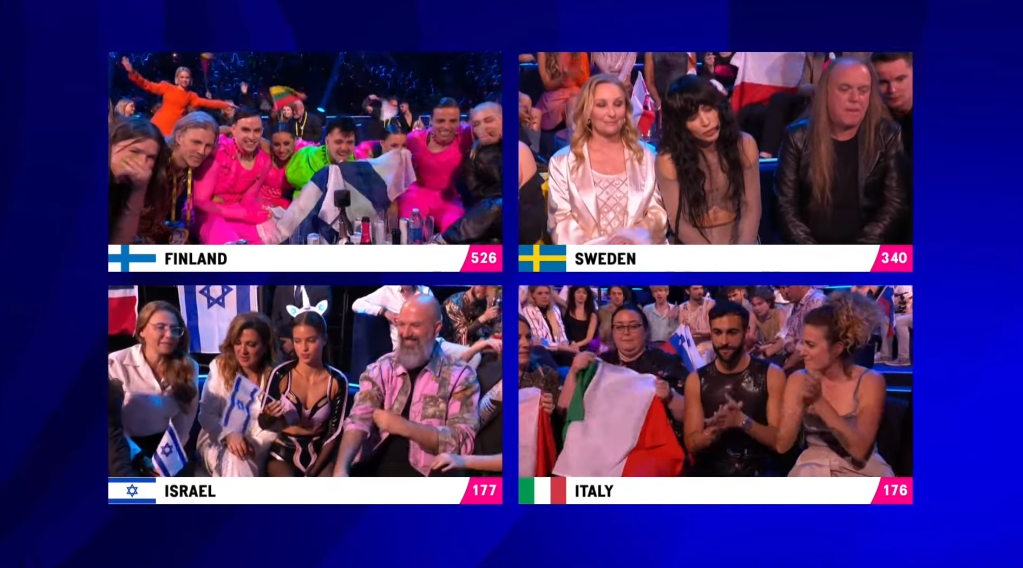 המסך מתפצל ומראה את ארבע המדינות, שמתמודדות כעת על הניצחון: פינלנד, שבדיה, ישראל ואיטליה.