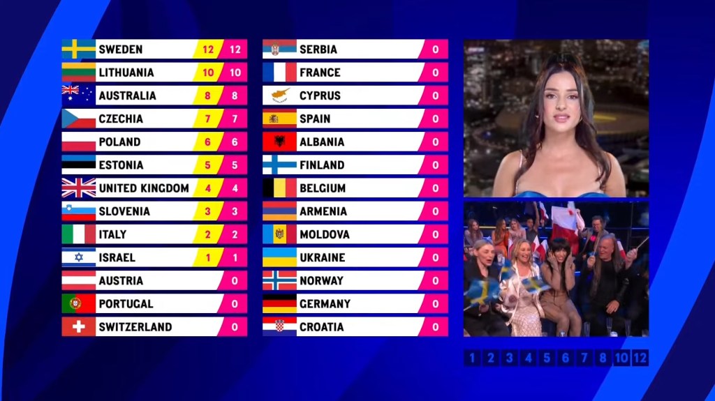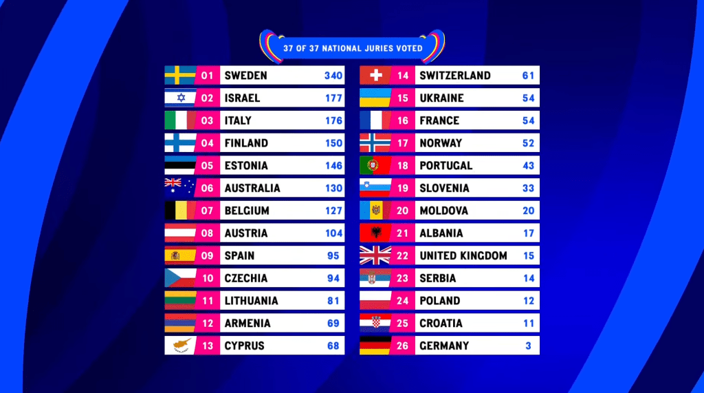 ישראל מקבלת 185 נקודות ועולה למקום השני. שבדיה מקבלת 243 נקודות וזוכה באירוויזיון.