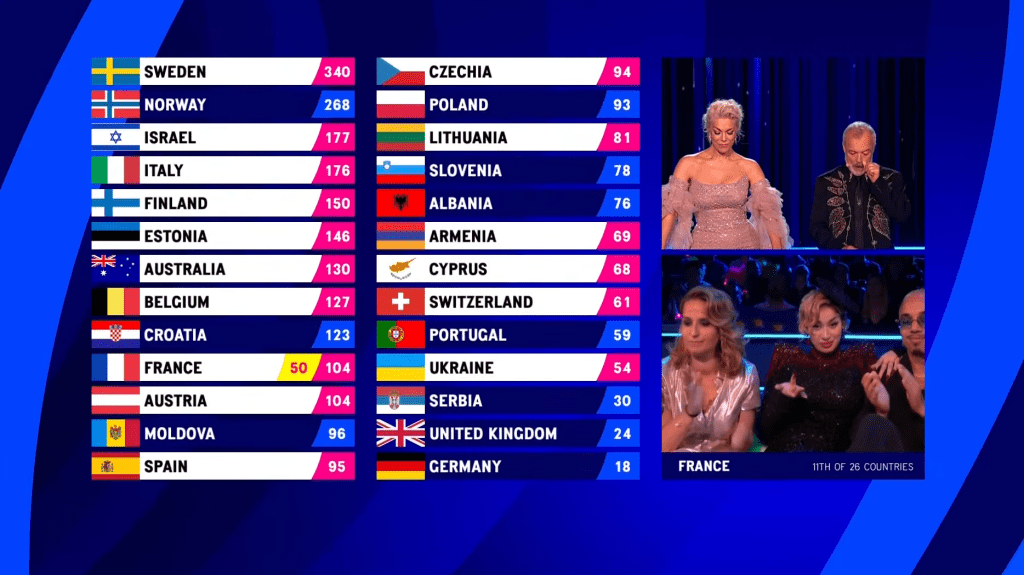 אחרי ראיון של Sanina ו-Dixon בגרין רום עם Loreen, הגיע זמן תוצאות הקהל. המנחים מכריזים על ניקוד הקהל המשוקלל מהמקום ה-26 של השופטים ועד המקום הראשון. ההצבעות של המקומות האחרונים של השופטים לא מרשימים במיוחד. עד שמגיעים לנורבגיה, שמקבלת 216 נקודות ועולה למקום השני. צרפת מקבלת 50 נקודות, ונציגת המדינה מציגה אצבע משולשת למצלמה, במה שעתיד לההיפך למם ברשתות החברתיות.