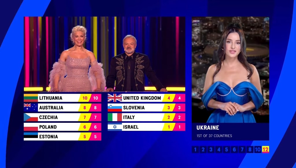 Norton ו-Waddingham מציגים את הצבעת השופטים. לוח הניקוד דומה לזה של שנה שעברה. פשוט ונקי. הרקע בכחול ותכלת. שמות המדינות בשחור על רקע לבן. הניקוד של המדינה הדוברת באדום על רקע צהוב. לימינו, הניקוד הכולל של על מדינה בלבן על רקע ורוד. הדגלים במלבן פשוט.