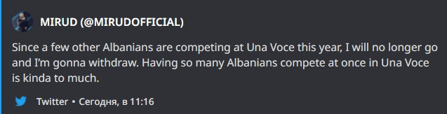 הזמר האלבני-אמריקאי, Mirud, החליט לפרוש מהליך הבחירה, לדבריו כי יש בתחרות יותר מידי אלבנים…