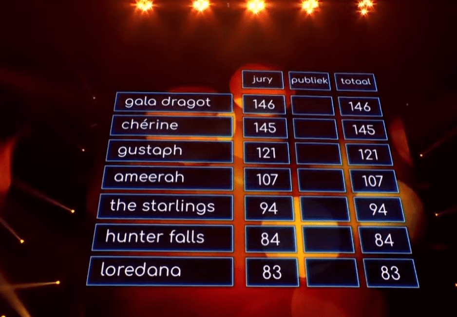 המנחה פותח בדברים, ומציג את השופטים: Alexander Rybak, Nikkie de Jager, Laura Tesoro ו-Jérémie Makiese. זוכת אירוויזיון 1986, Sandra Kim, מגיעה להעניק ל-Jérémie Makiese תקליט זהב או פלטינה. הקווים נפתחים והתחרות מתחילה.