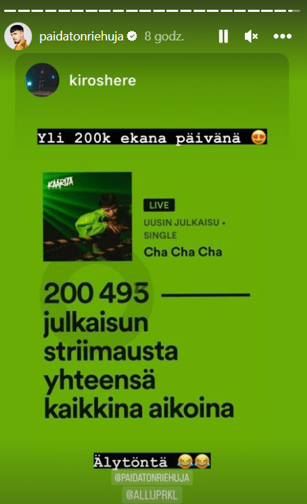 "Cha cha cha" שובר שיאים. הוא שיר הקדמים בפינלנד עם הכי הרבה האזנות ביממה הראשונה לפרסומו עם למעלה מ-200K האזנות ב-24 השעות הראשונות.