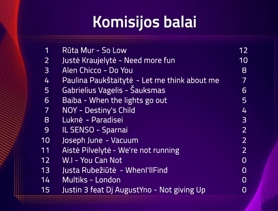 Justa Rubežiūtė – When I'll Find – שיר פופ-קאנטרי קצבי ומרומם נפש. לא בטוח שזו הזמרת הנכונה לשיר, הקול שלה חלש והמבטא לא מבטיח. היא עולה באאוטפיט חום-סגול כעור למדי. בפזמון מצטרפים אליה שני זמרי ליווי בלבוש תואם ובחוסר כריזמה תואמת. זה נראה כמו הופעת בית ספר תיכון. שום דבר שם לא עובד כמו שצריך. 2/5.