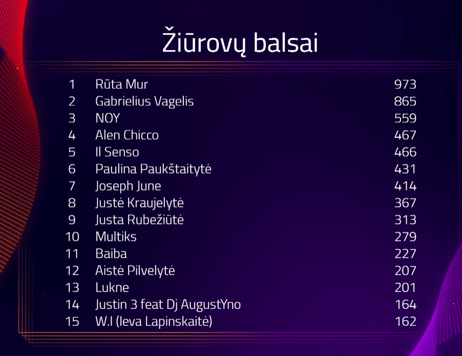 Gabrielius Vagelis – Šauksmas – שיר ראשון בליטאית. הוא לבוש חליפה שחורה שיקית ושיערו אסוף לאחור. הפזמון חזק, ניינטיזי, אירוויזיוני, קודר. עמו על הבמה להקה. זה דרמטי, מהודק מלודית. בוידאוארט מאחורה צורות מרובעות שחורות ולבנות. זה השיר הכי טוב עד כה, בנוי נכון, מתפתח, אמוציונלי. משאיר אחריו שובל של רגשות. 4/5.
