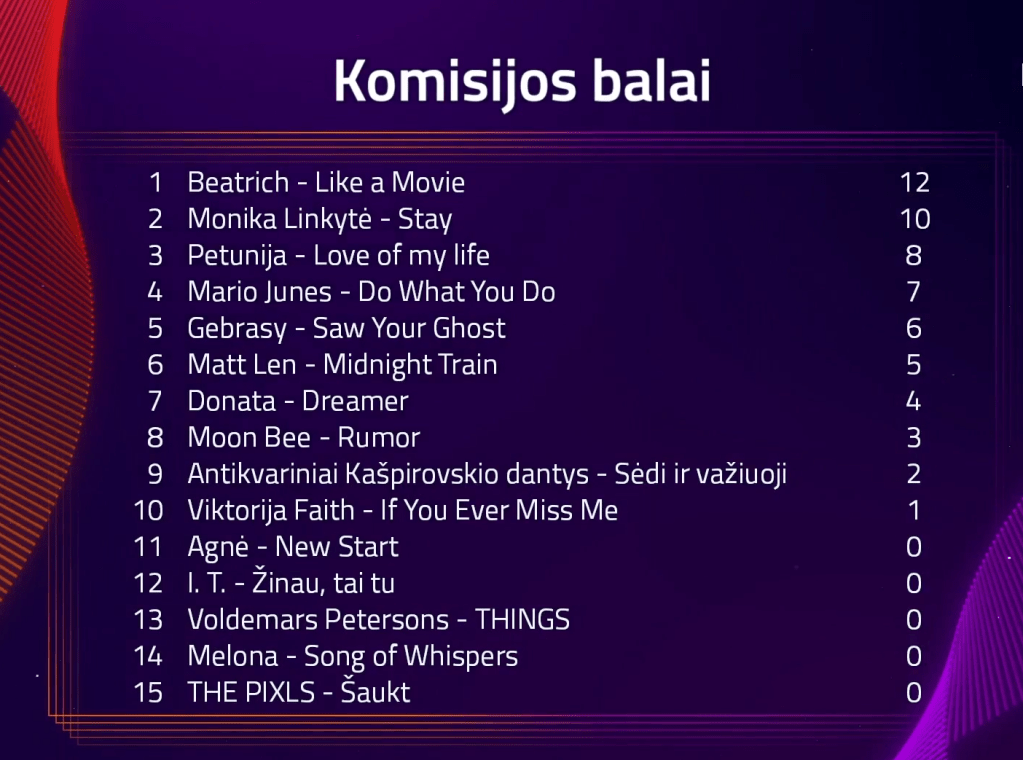 Monika Linkytė – Stay – היא ייצגה את מדינתה באירווייזון 2015 כחלק מצמד, ועכשיו היא חוזרת לנסות שוב. ההופעה מתחילה בקלוזאפ על פניה. היא לובשת חליפה לבנה ואוזניה מקושטות במן תכשיטים כתומים. המצלמה מתרחקת בפזמון. היא מלווה על ידי שלוש זמרות ליווי בשחור. זו בלדת פופ-Soul נעימה לשמיעה, אך לא מהודקת מספיק. המלודיה עצמה נשמעת מוכרת מידי. אני חושב שהמקום שלה בשלב הבא די בטוח . 3/5.