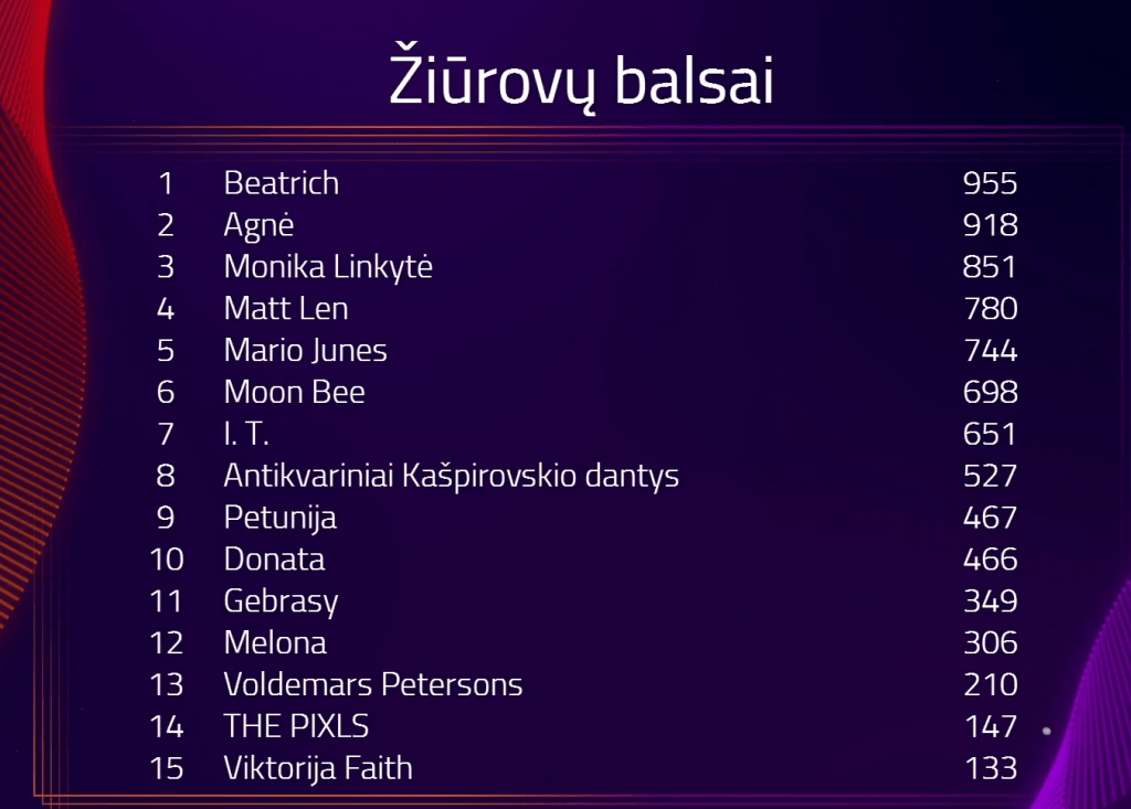 ניתן לצפות כאן או כאן. את הערב פותחים המנחים, Giedrius Masalskis ו-Nombeko Augustė. המנחה מאחורי הקלעים הוא Richardas Jonaitis. חמשת השופטים הם מבקר המוזיקה Ramūnas Zilnys, הזמרת Ieva Narkutė, המוזיקאי Jievaras Jasinskis, המפיק והמלחין Leonas Somovas והסולנית לשעבר של Pieno lazeriai, הלא היא Giedrė Kilčiauskienė.
