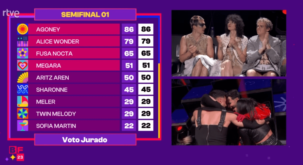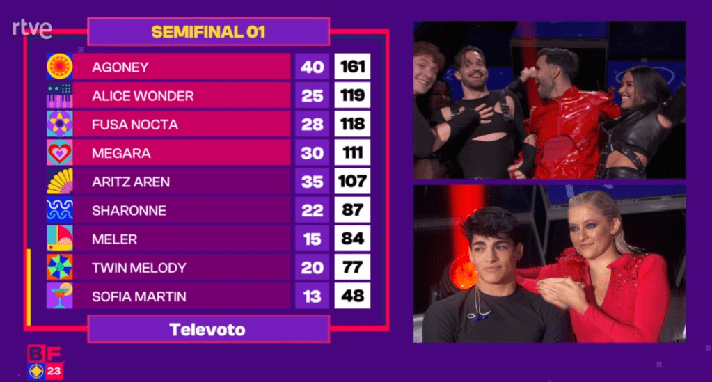 Agoney – Quiero arder – בסקירת השירים כתבתי: "השיר מתחיל בצלילי כינורות מתגברים ואז נכנס המקצב הדרמטי. זה שיר פופ-האוס-טכנו-מועדונים, שהזכיר לרבים את שירו של מיכאל בן דוד לאירוויזיון 2022. בשלב מסוים Agoney מתחיל לצעוק משל היה זמרת פלמנקו עצבנית. בבתים הוא עובר לשירה נוגה ושמאלצית, שבונה דרמטית לפזמון הצפוי, רווי הדרופים. זה הרבה פחות מעצבן מ-"I.M", מופק הרבה יותר טוב, אבל עדיין בעל תוקף קצר מידי להרגשתי. זה יכול להפתיע בהופעה. 3/5."