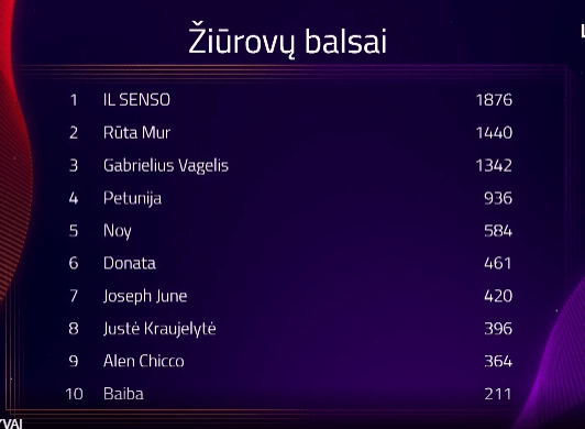 Gabrielius Vagelis – Šauksmas – בטרום הגמר כתבתי: "הוא לבוש חליפה שחורה שיקית ושיערו אסוף לאחור. הפזמון חזק, ניינטיזי, אירוויזיוני, קודר. עמו על הבמה להקה. זה דרמטי, מהודק מלודית. בוידאוארט מאחורה צורות מרובעות שחורות ולבנות. זה השיר הכי טוב עד כה, בנוי נכון, מתפתח, אמוציונלי. משאיר אחריו שובל של רגשות. 4/5."