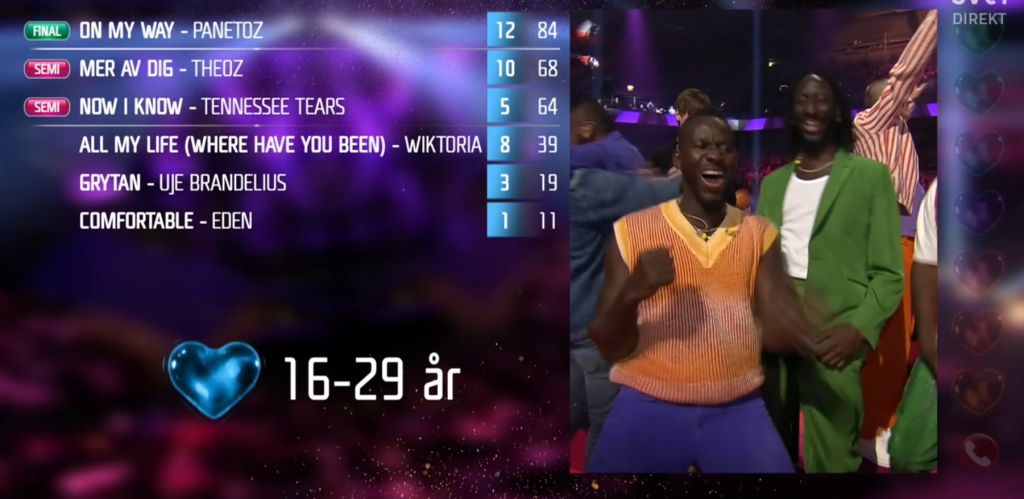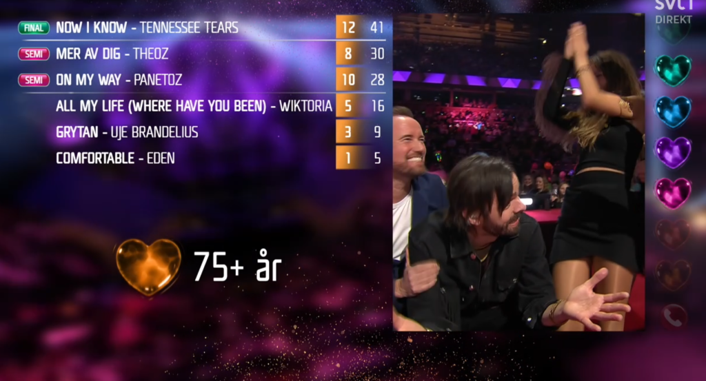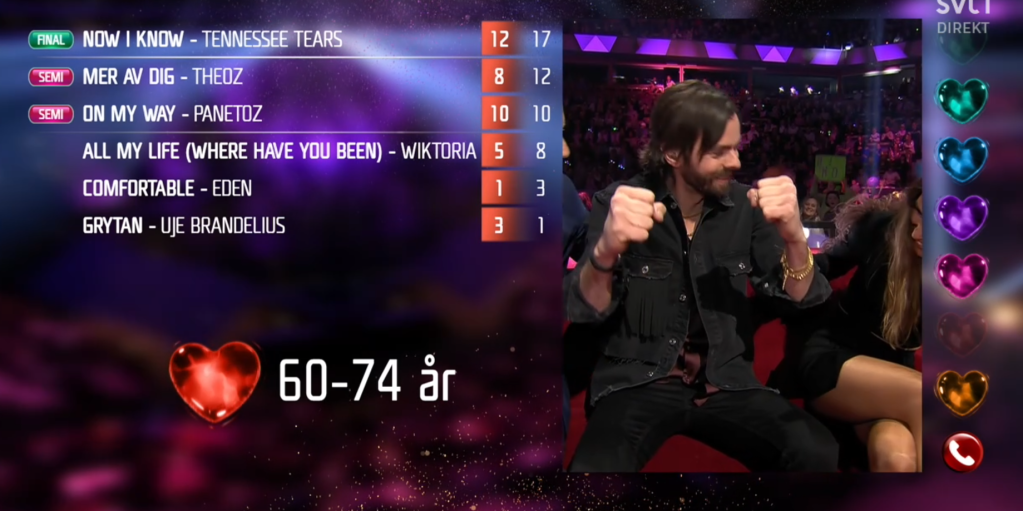 Theoz – Mer av dig – שיר קצבי ורקיד, להיט קיץ וביטים של מועדונים. מזכיר מאד את "Som du vill" שלו. הוידאוארט כאילו מפוקסל ועמו על הבמה שני רקדנים. הוא לובש ז'קט ירוק בקבוק וחולצה לבנה מתחת. יש פירוטכניקה. השיר בשבדית מלאה, האווירה שמחה, שלאגריסטית, ההופעה זורמת. אולי זה DTF? מה שבטוח, זה להיט, עם הרגשת Throwback. נכון לעכשיו, זה הכי קומפטטיבי. הקהל משתגע. 3/5.