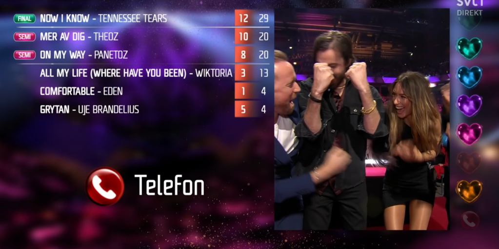 אף פעם אל תשכחו את כוחו של סיפור עצוב על המצביעים. הקווים פתוחים כעת עבור ששת השירים הנותרים. כעת מופע ביניים שני: לינדה בנצינג ו-Magnus Carlsson.