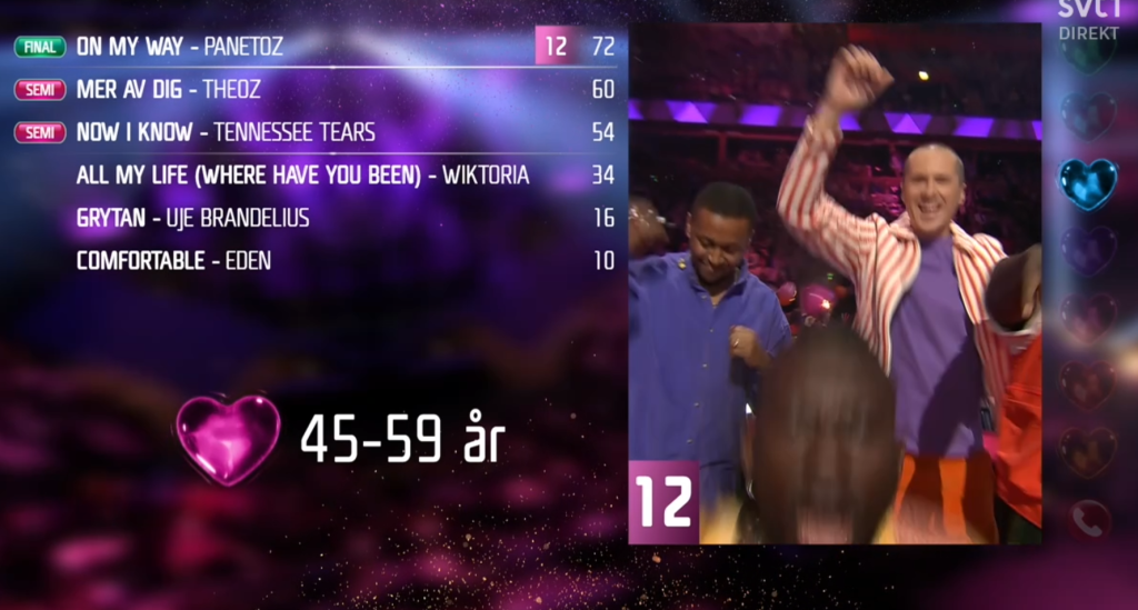 Panetoz – On My Way – ההרגשה על הבמה טרופית משהו, והצבעים השוךטים הם סגול, צהוב, ירוק וכתום. שיר נשמה ללא נשמה וללא עוצמה. נשמעו הרבה השוואת ל-Medina ול-Anis Don Demina. מרבית השיר בשבדית. בשיר משתלבים סגנונות שונים, קצת בלקני, קצת ערבי, קצת ראפ. זה שיר כיפי, הכי טוב עד כה. הבתים הם ראפ, והפזמון הוא קצת שלאגר. חמוד מאד, ולא לוקח את עצמו ברצינות. 3/5.