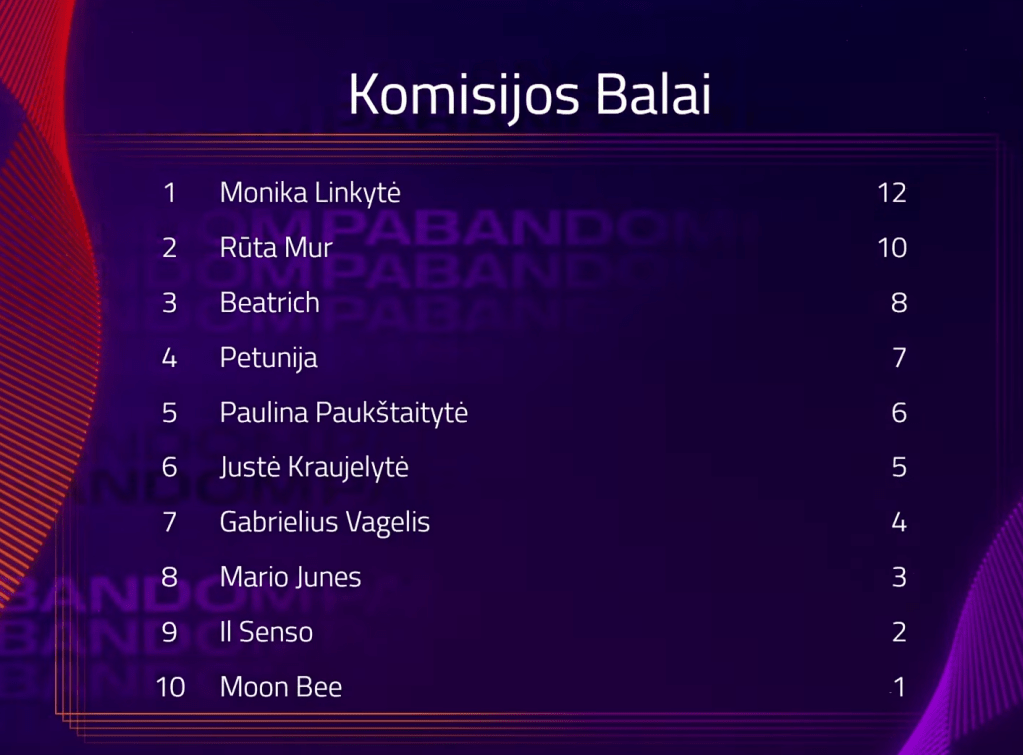 קולות הקהל והשופטים מתורגמים ל-1-8, 10 ו-12. יש תיקו בין Rūta Mur לבין Monika Linkytė, אך קולות השופטים קובעים. Monika Linkytė זוכה.