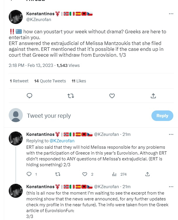 בהמשך למה שפרסמתי בשבוע שעבר, רשות השידור של יוון מציינת כי פגיעה בהשתתפותה בתחרות, עקב התביעה של Melissa Mantzoukis, תהיה באחריותה הבלעדית של התובעת.